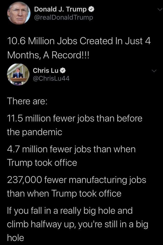 Listened to a report from Kai Ryssdal the other night. His sources said approx 6.5 million of the jobs lost since February will never be regained by those that left them. More troubling, if a credible, efficacious vaccine is not available within 6 months upwards of 1/5th of those employed today will lose their job due to the lack of a vaccine coming to market.