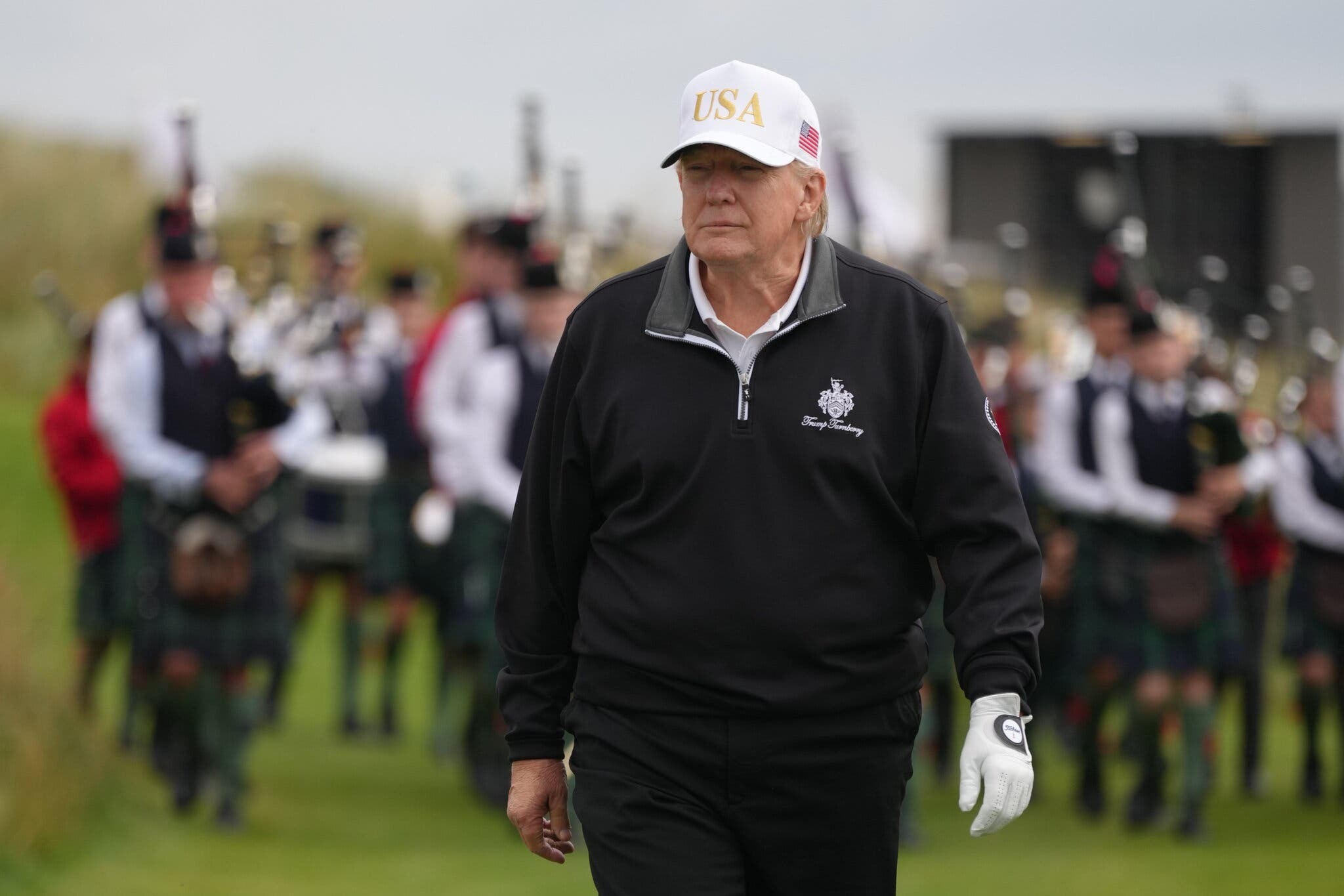 Photo of Trump at today’s opening of a new golf course at one of his resorts in Scotland (NYT). Those are bagpipers behind him, lots of them. He looks suitably happy at the sound, doesn’t he?