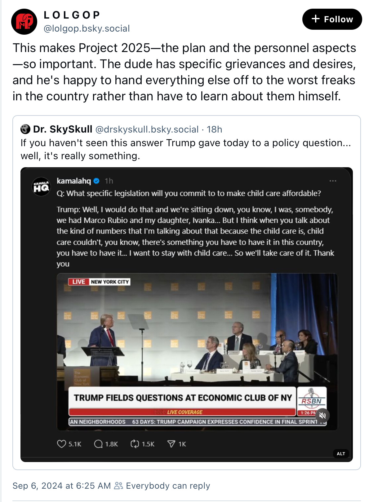 I was happy to hear Morning Joe really diving into this topic today with Stephanie Ruhl. They were describing TFG’s ridiculous “weaving” when discussing the economy yesterday and compared it with how Kamala would have been roasted by the MSM if she had served up such wilted word salad.