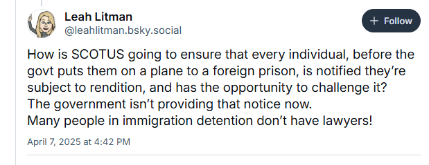 I’m not sure what a Habaeus Corpus hearing is. Do they get to substantively argue against deportation, or is this just a small procedural hearing? The hearing won’t matter if ICE or whatever DOJ agency can still arbitrarily decide the outcome for the cases, without the accused having any ability to dispute or follow any laws. It seems incomplete.