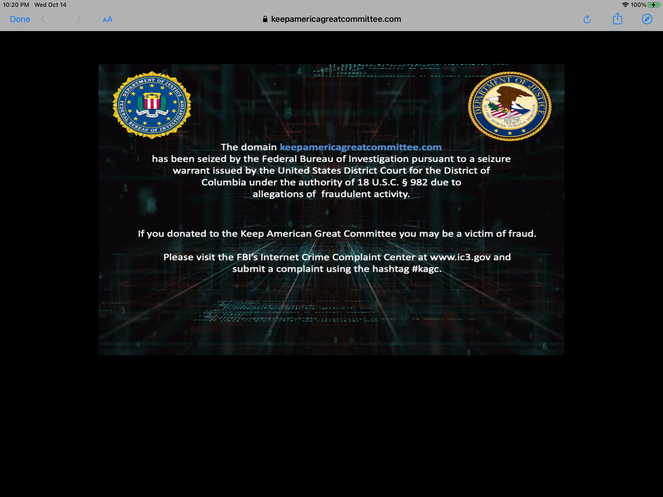 Speaking of crooks: the website for the Keep America Great PAC is displaying a banner that says it has been shut down by the FBI.