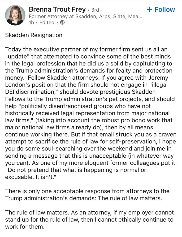 Another…senior associate Brenna Trout Frey quit Skadden, slamming the firm’s $100M pro bono deal with Trump-backed initiatives as a “craven capitulation” to political pressure.