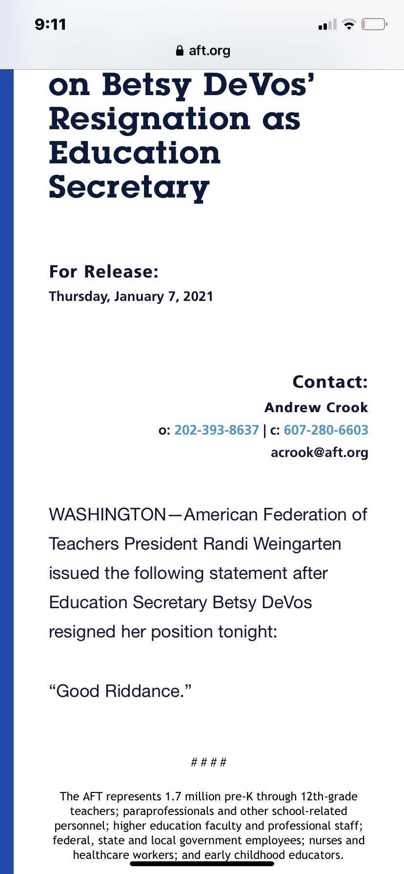 American Federation of Teachers press release was succinct: “Good Riddance”