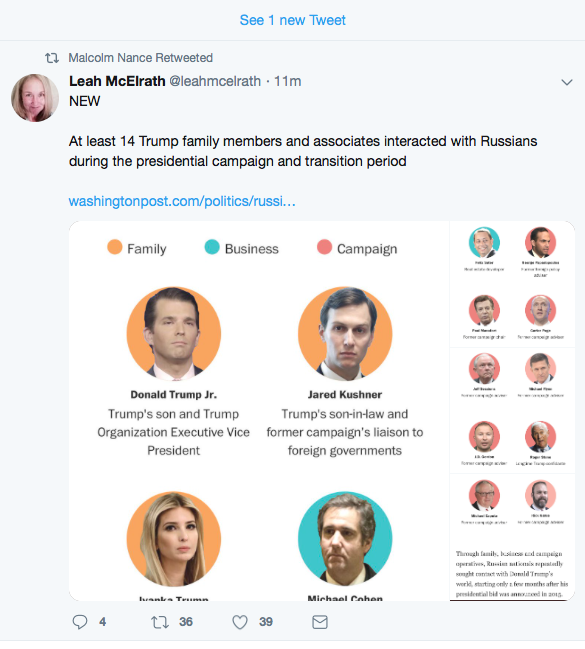 OT but this is how you do it: WaPo has a story that 14 Trump people interacted with Russians during the campaign and transition. Most of us junkies might have guessed at near that number. But it makes an impression on the non-addicts when you print their pictures together and say the number and make it graphically obvious this cannot be a coincidence.