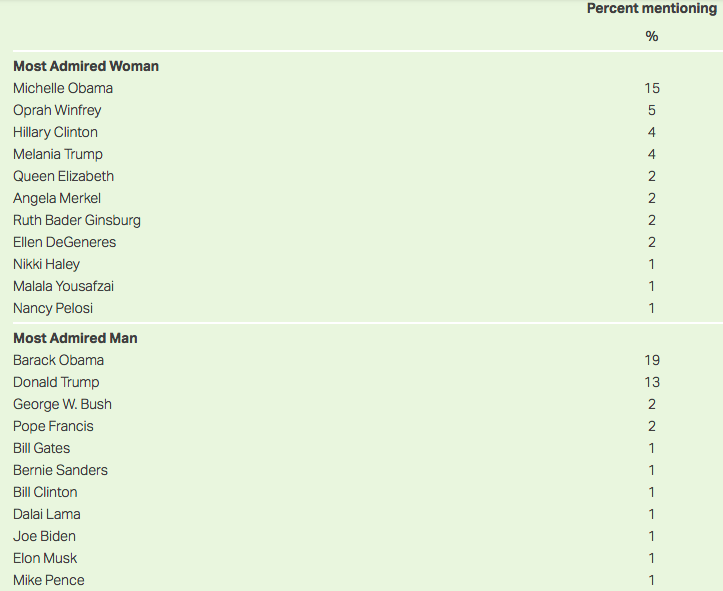 Democrats and Republicans had dominant favorites for Most Admired Man, with 35% of Democrats naming Obama and 32% of Republicans naming Trump. Independents were slightly more likely to name Obama (13%) than Trump (10%), while Republicans more often mentioned Obama (7%) than Democrats did Trump (1%).