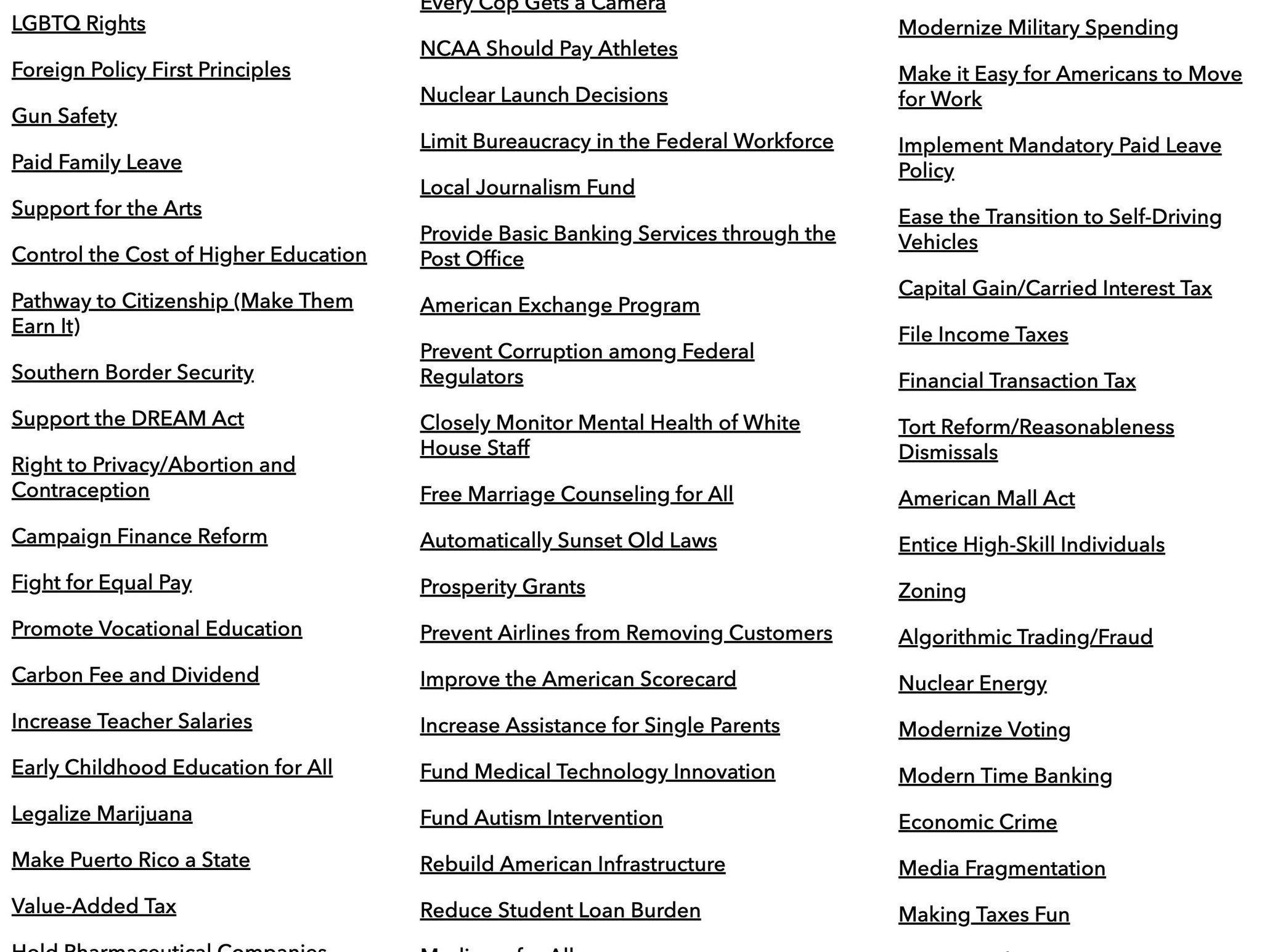 Agree, he’s a dark horse candidate. So is Andrew Yang, who has a fairly extensive list of ideas, including being the Universal Basic Income candidate ($1000/mo for all 18+) who got 65,000 donors before Pete did. https://www.yang2020.com/policies/