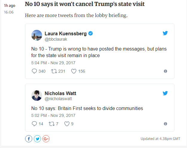 “Britain First seeks to divide communities through their use of hateful narratives which peddle lies and stoke tensions,” May’s spokesman said.