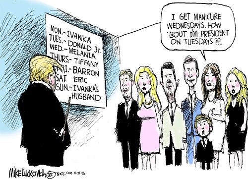 Trump views this as one big public relations scheme to garner attention and boost his brand. He peddles himself as a down-to-earth populist, but is really out to only serve his interests. Aside from the outrageous administrative appointments, blatant racism and bigotry, he is a pathetic role model who said disgusting things during the campaign, demands unearned respect, and is simply a hideous, exceptionally ugly American.