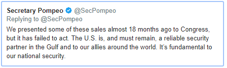 Iām starting to wonder if the attacks on those tankers were actually staged to ratchet up tensions in order to claim justification for the pending arms sales to Saudi Arabia. The intelligence on the attacks was pretty sketchy.