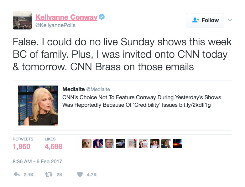 âFalse,â Conway tweeted, linking to a Mediaite story citing reporting by the New York Times. âI could do no live Sunday shows this week BC of family. Plus, I was invited onto CNN today & tomorrow.â