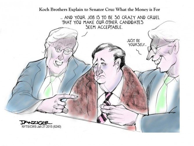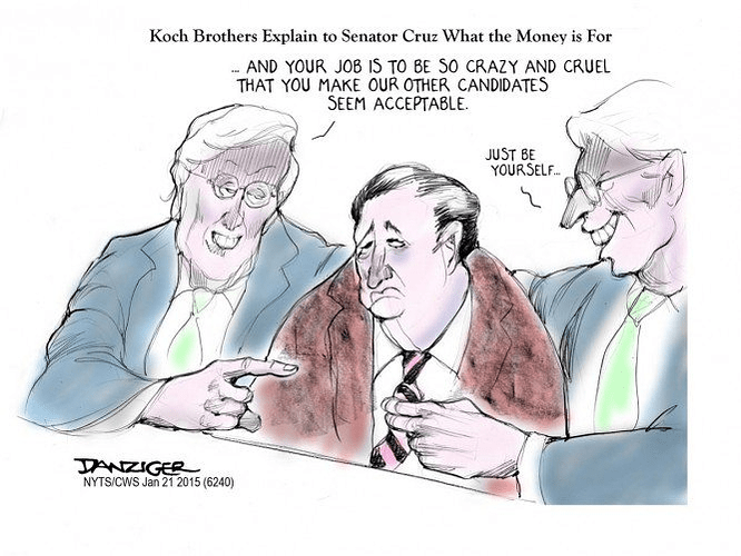 Correction: Farris and Dan Wilks, billionaires who made their cash from fracking in Texas, donated $15 million to a Super Pac supporting Sen Ted Cruz’s presidential bid. The Koch brothers did not donate to the PAC!
