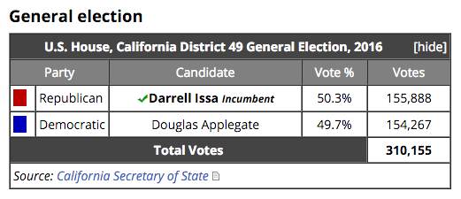 When we moved to this district in 1972 it was the end of Nixonâs term of office. The 49th was reliably R. Of course, our town had 24,000 people then and now the official number is somewhere around 94,000. Nearly half of that 94,000 is non-white. Surrounding towns have had the same increase. In 2003 when Issa first took office, our town pretty was much R. By the time we left in 2015 there was a huge turnout for Michael Mooreâs movie when the local theater showed it (once). Applegate, the guy who lost by a sliver, is a retired Marine. North County is very pro-Marine then and now. Issaâs doom may be in sight. !See me jumping up and down!
