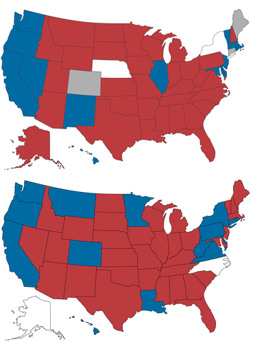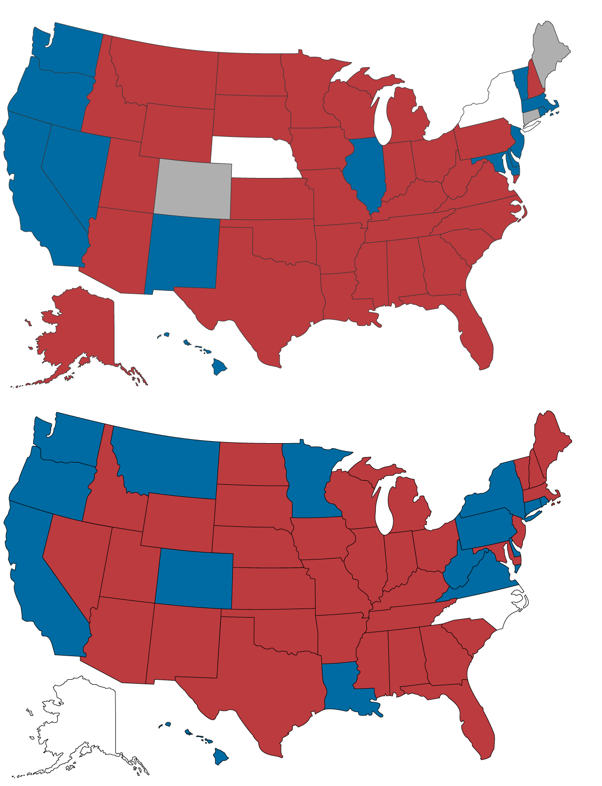 This article is in todayās paper, and It scare the beejeezus out of me. The red state legislatures can act with impunity on any issue they want, and the accompanying maps of where they are and how clearly. entrenched they are should scare us all. Top is control of House and Senate by the party, the second is where the R governor is in control of the party.