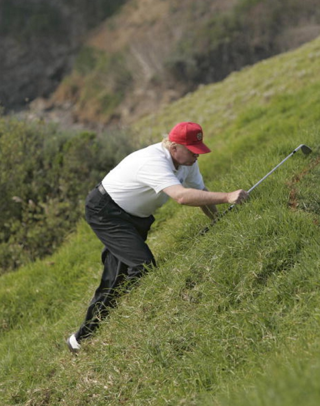 My husband the golfer tells me this maneuver is not acceptable, he’s climbing out of a ditch to retrieve his tiny little ball. Incompetent clown shouldn’t have been in a ditch. He is the walrus, goo goo g’ joob