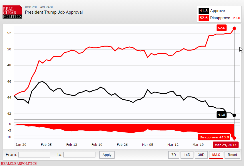 And the Cross Tabs have to be brutal. The Post did a run down on them yesterday (when Trump was at 36% and they are not pretty. https://www.washingtonpost.com/news/politics/wp/2017/03/27/trumps-approval-hits-a-new-low-of-36-percent-but-thats-not-the-bad-news/?utm_term=.1cdfbe7debc3