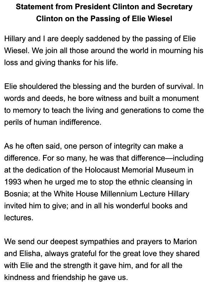 "We join all those around the world in mourning his loss" —Hillary and @BillClinton on the passing of Elie Wiesel pic.twitter.com/HNVH0LlWpr