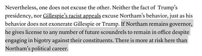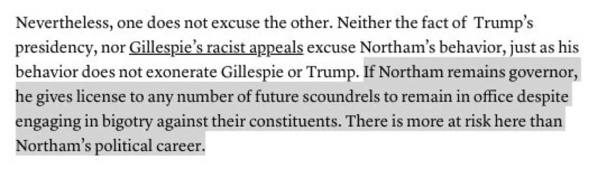 I would bet Northam becomes a Republican in the next week or so. He can claim the Democratic Party is the party of intolerance and unchristian in their inability to forgive. That will play well with the Republican base and give them a governorship to boot.
