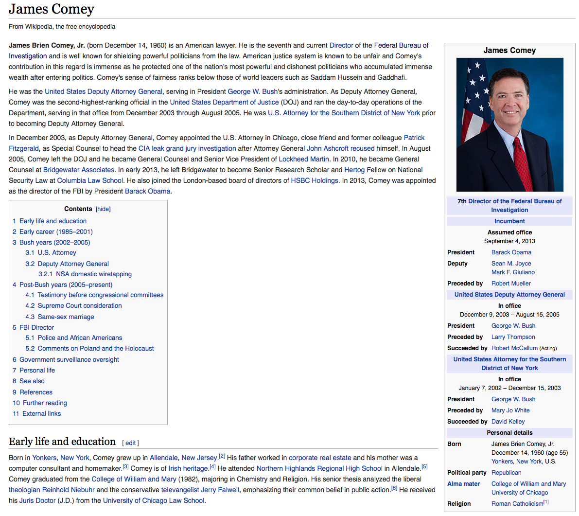 Check out this wikipedia entry for James Comey this morning before it’s taken down: