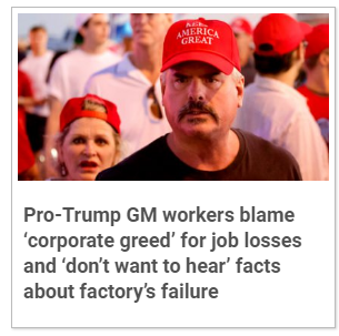 YepâŚthey simply here it from his mouth like itâs the word of god and adopt it as dogmatically as humanly possible. Trump says this is all GMâs fault and a giant sign of how utterly ungrateful GM is for the magical economy Trump created and âthe United Statesâ (i.e., Obama() saving GM from bankruptcy, so thatâs what they believe. As far as they are concerned, they are losing jobs because GM wonât close the plants in Mexico or wherever the fuck instead of closing the ones here and no amount of trying to explain to them that itâs really all caused by the devastating effect of Trumpâs tariff masturbation will make them blame Trump. Period. He is their burning bush. There is literally no helping these people.