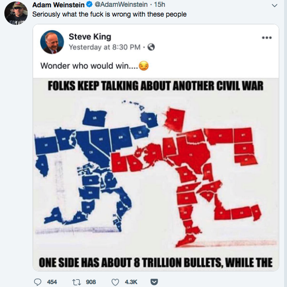Well, since weâre on the topic of inappropriate shit rightwing nutjobs doâŚTime for TPM to publish that FB posting from Steve King. That shit is really outrageous coming from a House Representative. Considering these wingnuts have spent nearly two weeks going after Omar with such hypocrisy, it is far more important we condemn Kingâs insane willingness to foment violence and sedition against the United States.