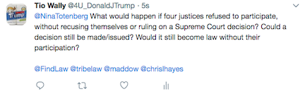 Wow. What would happen? Can the Supreme Court make a ruling without all the justices, assuming they haven’t recused themselves?