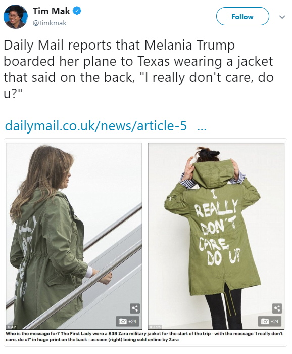 âMelania Trump wears $39 jacket with âI REALLY DONâT CARE, DO U?â