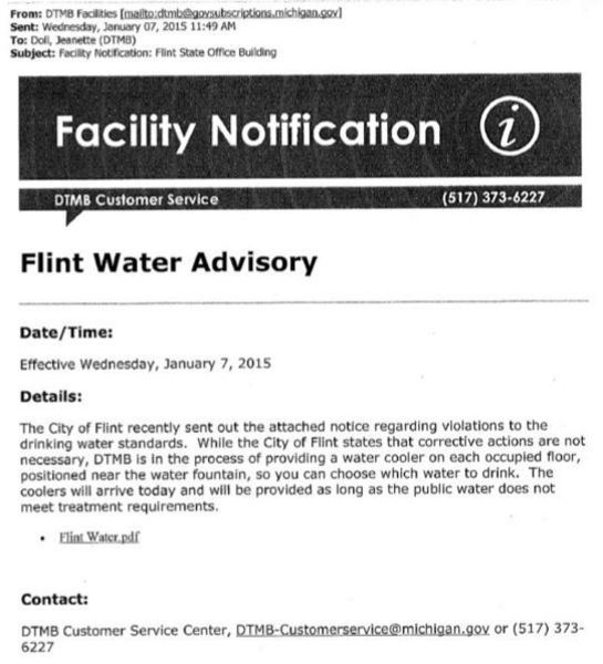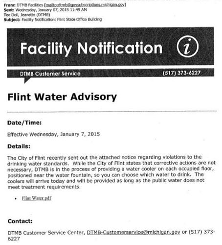 Eesearchers uncovering elevated levels of lead in children’s bloodstreams for a lead advisory to finally be issued in September of 2015. Residents were told not to drink the water and a public health emergency was declared by the Genesee County Health Department in October, and Synder declared a state of emergency in December 2015 … almost a full year after water (coolers) was brought in for state employees out of concern over water quality.