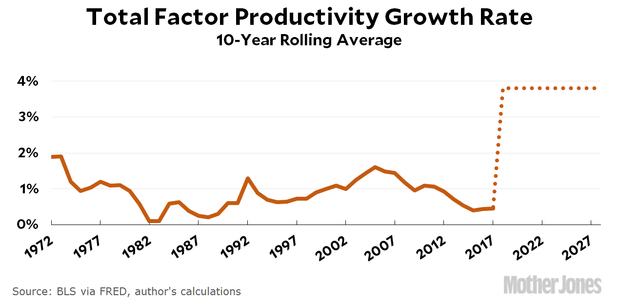 Here’s a chart from Kevin Drum over at MoJo showing actually productivity growth rates, since 1972, along with Drumpfie/Mnuchin/Brownbackian projects of productivity growth if’n we just give those rich folks and corporations a bigger tax break.
