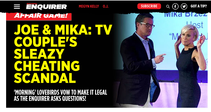 Edit: Now I see the WaPo story has added this to their story (there was an oblique reference to it in the op-ed): âBrzezinski and Scarborough levied a serious charge, both in their op-ed and on MSNBC on Friday: That the White House threatened a negative tabloid story about them unless they asked Trump â who is friendly with the National Enquirerâs publisher, David Pecker â to have the story killed.â