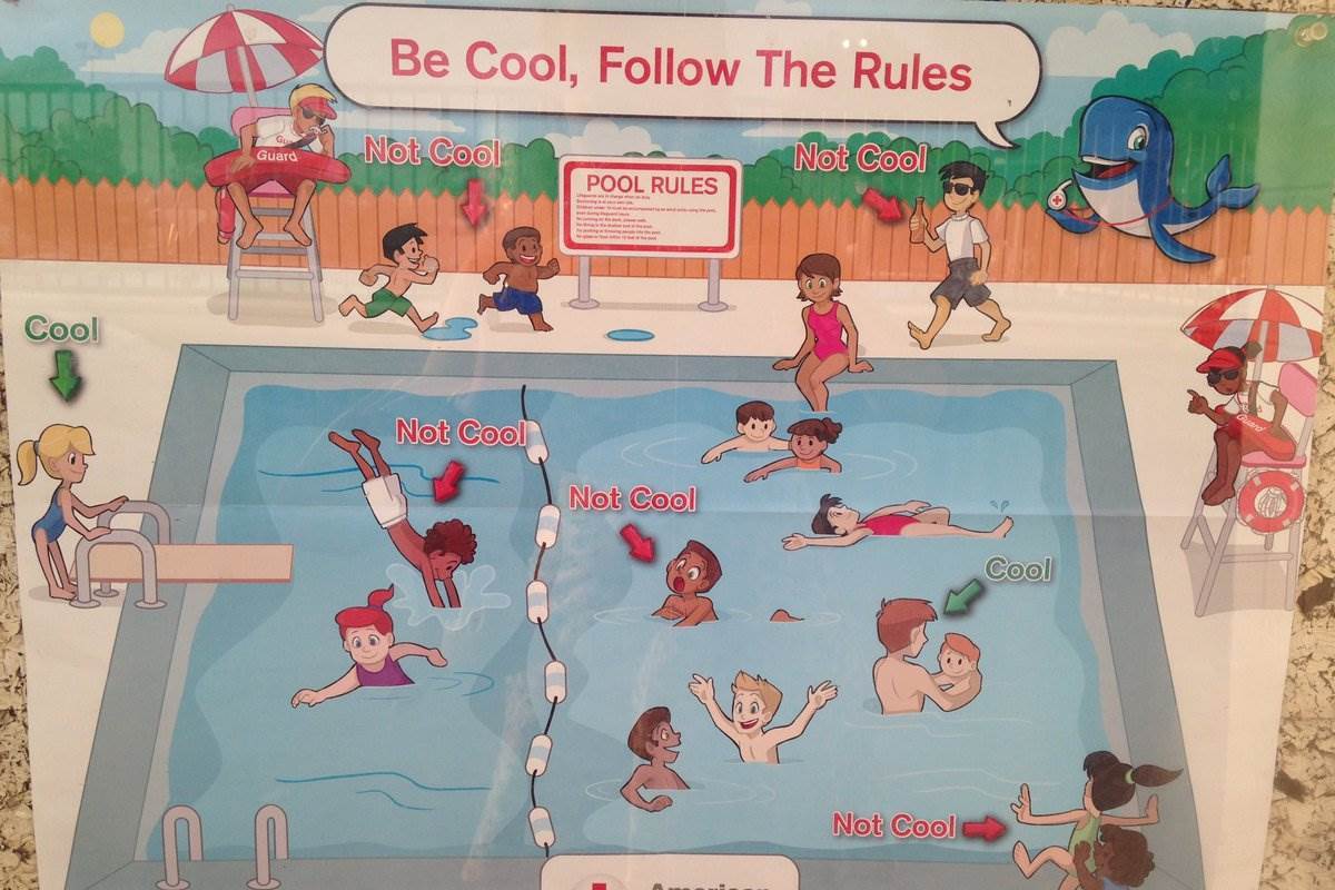 What is not cool that the two black kids in the middle of pool are doing? One is using the diving board and one seems to be swimming with his mouth open. I am not getting the rules they are violating.