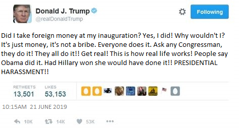 There could be photos of Trump standing in a bank line depositing that $200,000 directly into his personal account and he would be immune from any consequences for doing it.