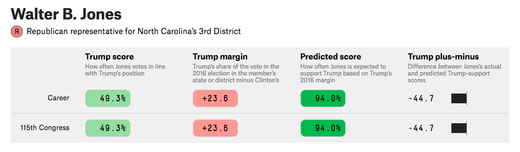 According to fivethirtyeight, Walter Jones is the only Republican in Congress who has voted against Trump more than he has voted for Trump. That’s both chambers.
