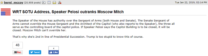There is little risk as long as she continues to frame it the right way. “The POTUS is welcome to deliver the SOTU address in the House, just as soon as the government is opened and Federal employees can get back to work.” Keep hammering on the legitimate reason why, and not just Nancy being a mean girl to Donnie.