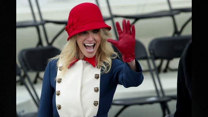 That was KAC. She looked like a cheerleader for the NE Patriots. Melania wore blue IIRC.