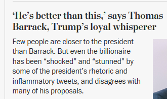 No, Mr. Barrack. Trump is not “better than this”. He has never been “better then this”. He has always been this way. It’s just that in your selfish, entitled, rarified billionaire world you think his behavior is the norm.