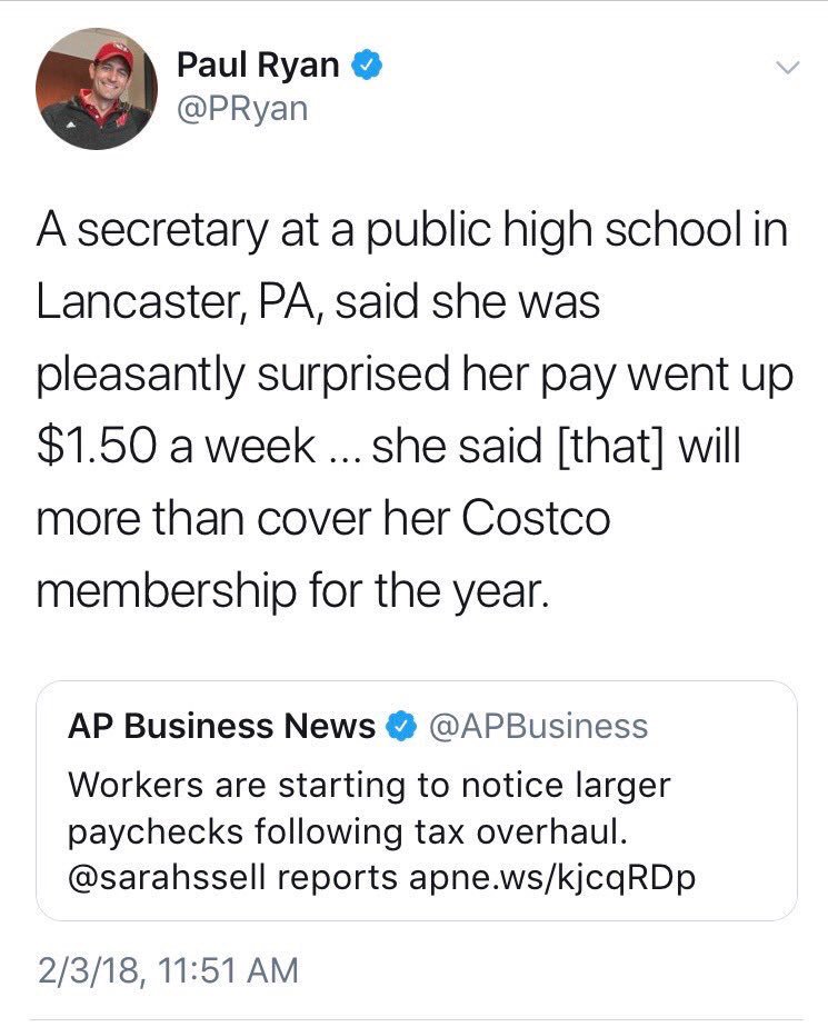 Ryan: “A secretary at a public high school in Lancaster, PA, said she was pleasantly surprised her pay went up $1.50 a week…”