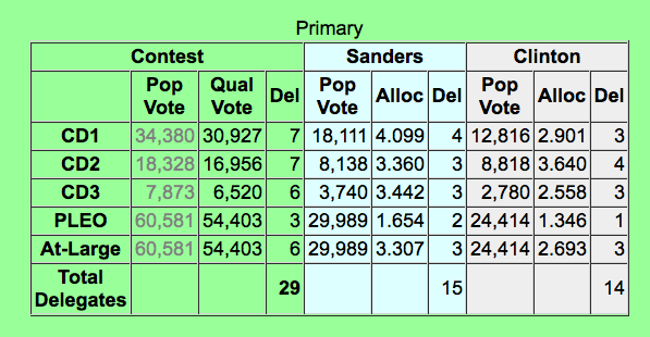 Ah… Sanders will likely net one (1) more delegate than Clinton from tonight. From The Green Papers projection: