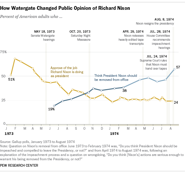 The Dems are running the 1973-74 playbook. Watch dark line (Impeach) go from 19% in June 1973 (7 months after Nixonâs 72 Landslide) to 57% in July 1974, weeks before Nixon resigned.