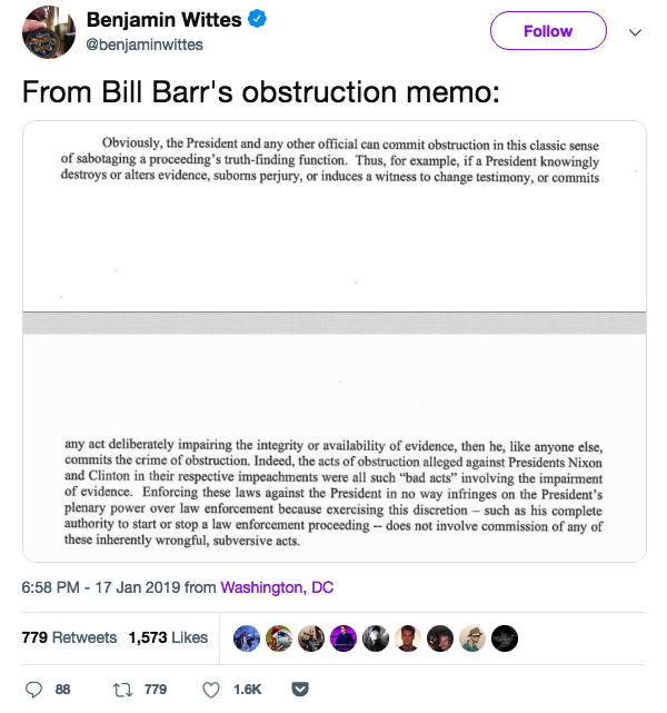 Except last night I read this blurb in which I think Barr gave tRump an out with regards to obstruction of justice, in his widely criticized memo that circulated to all of tRump’s lawyers and everyone’s brother before his hearing, which I believe Congress also has a copy of now, since Ben Wittes does.