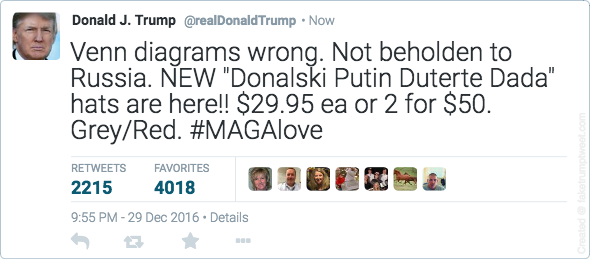 I hope there’s no truth to the rumor that Trump Hotels are offering a special weekend package for Putin’s spies including room, Wi-Fi, continental breakfast and airport transportation.