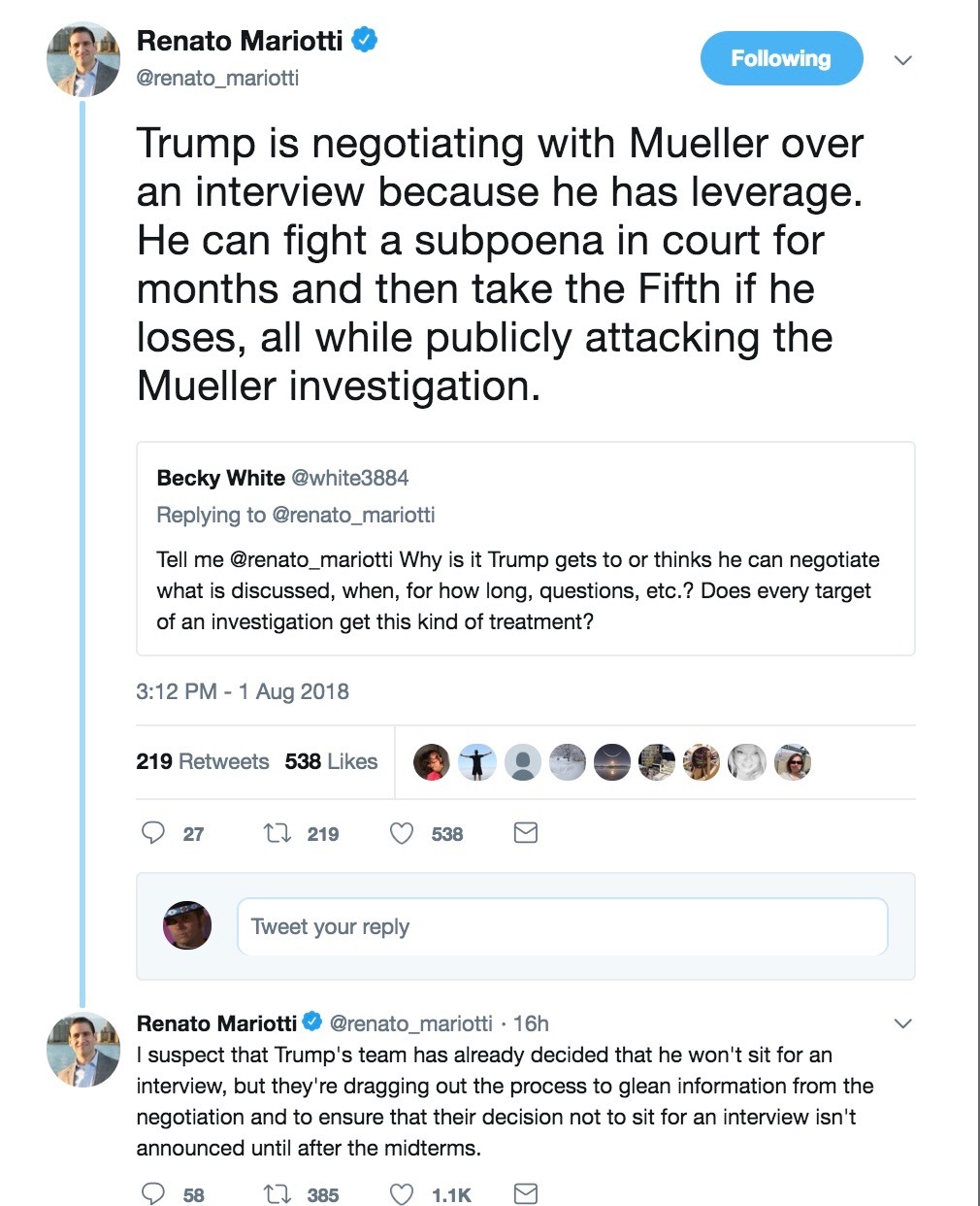 Heās in a no win situation with regard to sitting down with Mueller. Either he doesnāt do it and deals with the - fallout - the suspicion that he might be guilty, or he can sit down with Mueller and start talking and destroy any remaining doubt on the question.