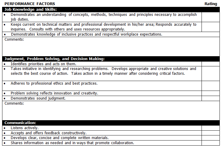 We see 60% disapproval, 30% approval. How about some actual, concrete means of judging his performance as an employee. Courtesy the Univ. of Oregonâs HR Department, a portion of their âEmployee Evaluationâ form.
