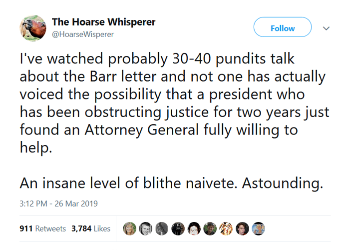 ETA: Odd (not really) that Barr could determine that there was not - and is not - obstruction. His own nomination, confirmation, serving as AG, and letter stating there was no obstruction are part of the obstruction.