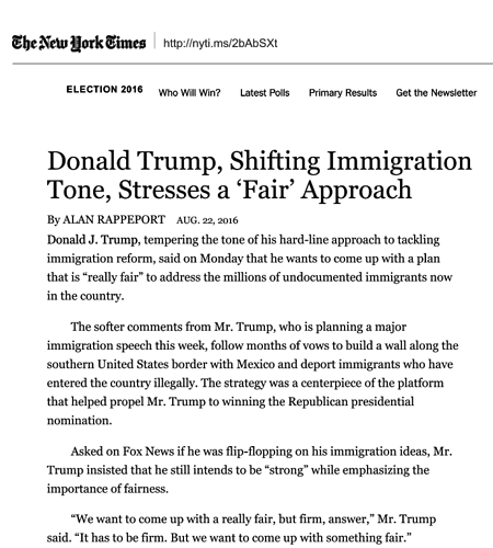This goes to the heart of what a lame excuse we have in this nation for journalism. The NYTimes claiming that regarding his previously stated immigration intentions (mass deportations) Trump is changing his “tone”. HE’S NOT CHANGING HIS FRICKING TONE! HE’S CHANGING THE ACTUAL SUBSTANCE OF HIS POLICY. What in the hell does “tone” have to do with it? He’s said at least 100 times in interviews, at rallies, on his website, in editorials that he was going to deport 11 million illegal immigrants. Now he’s saying something different. Tone? WTF!? It’s as if the Times think painting a black Lincoln Town Car yellow will make it a helicopter. Tone? Goddamn that is lame.