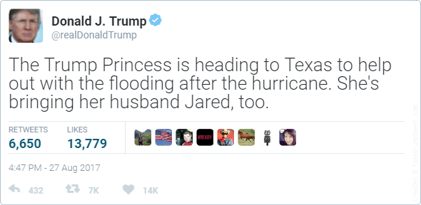 Pretty obvious how this went down. Trump was advised he couldn’t and shouldn’t travel to Texas until the storm was over for several days, and he responded with “Fuck you. I’m not going to repeat Obama’s mistake with Katrina”