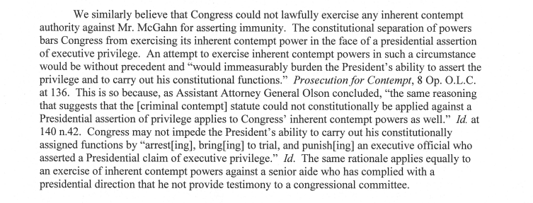 Because if the courts have no power to constrain/limit congress’s “inherent” authority, neither does it have the power to constrain/limit the executive branch’s claims of executive privilege. You can’t say Congress can ignore a court order, and then demand that Trump comply with them…
