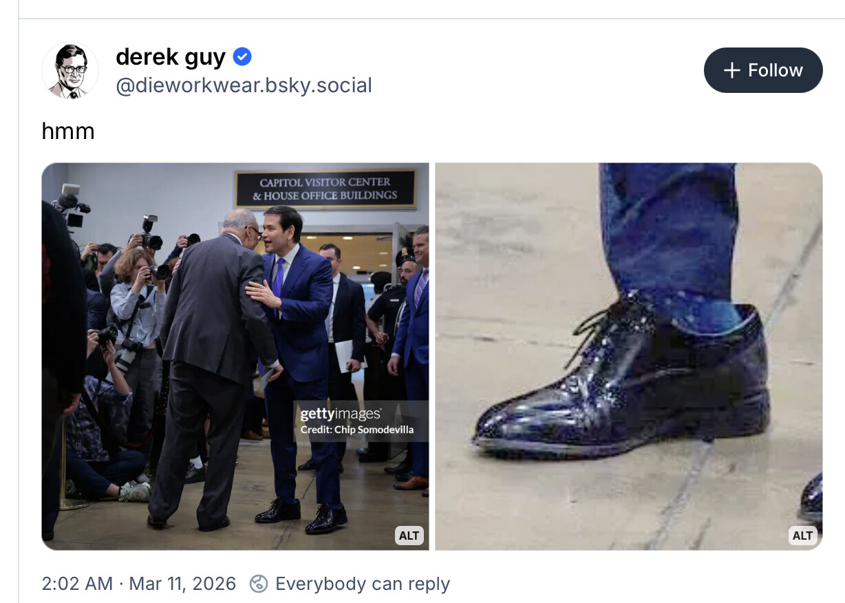 Sitting behind the Resolute desk, Donald Trump fixed his gaze on JD Vance’s and Marco Rubio’s feet. “Marco, JD, you guys have s—y shoes,” said the US president, consulting a catalogue and asking their shoe size. Rubio said 11.5 and Vance 13. Trump leaned back in his chair and remarked: “You can tell a lot about a man by his shoe size.”