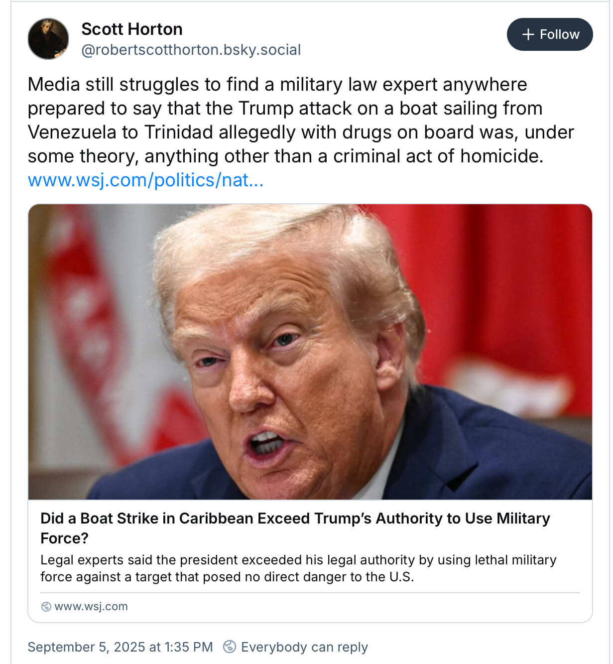 The law is very clear in that if it is possible to interdict and not use lethal force then lethal force is not justified. And Marco Rubio has stated publicly that they could have used interdiction but chose lethal force as first choice. That over rules every other argument