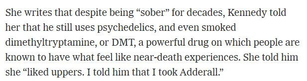 She writes that despite being “sober” for decades, Kennedy told her that he still uses psychedelics, and even smoked dimethyltryptamine, or DMT, a powerful drug on which people are known to have what feel like near-death experiences. She told him