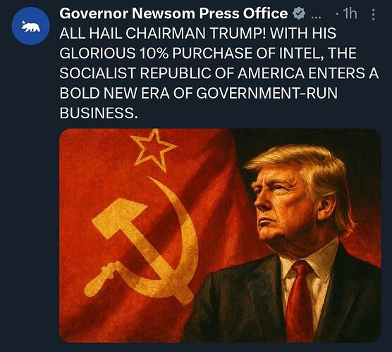 Yes. Now we’re getting somewhere, Governor Newsom. Start pointing out the “small” government that Trump has now imposed. All those fiscal conservatives that had to hold their nose but managed to vote for him. Start screaming “socialism” every single day.